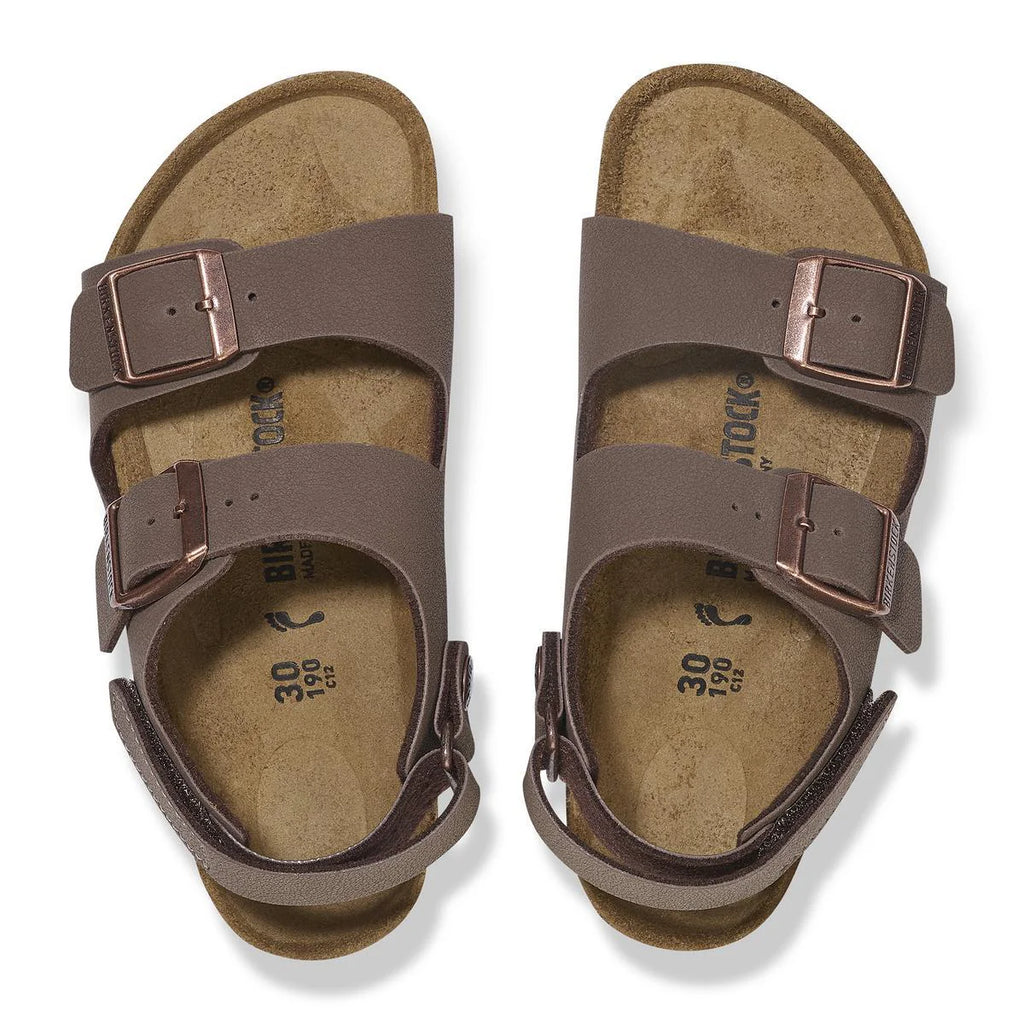 Milano for kids. The BIRKENSTOCK Milano is our classic back-strap model which offers comfort and support for little feet. The cork-latex footbed has softer features to promote the natural growth of feet and the upper is our skin-friendly Birkibuc material which is durable and easy to care for.
