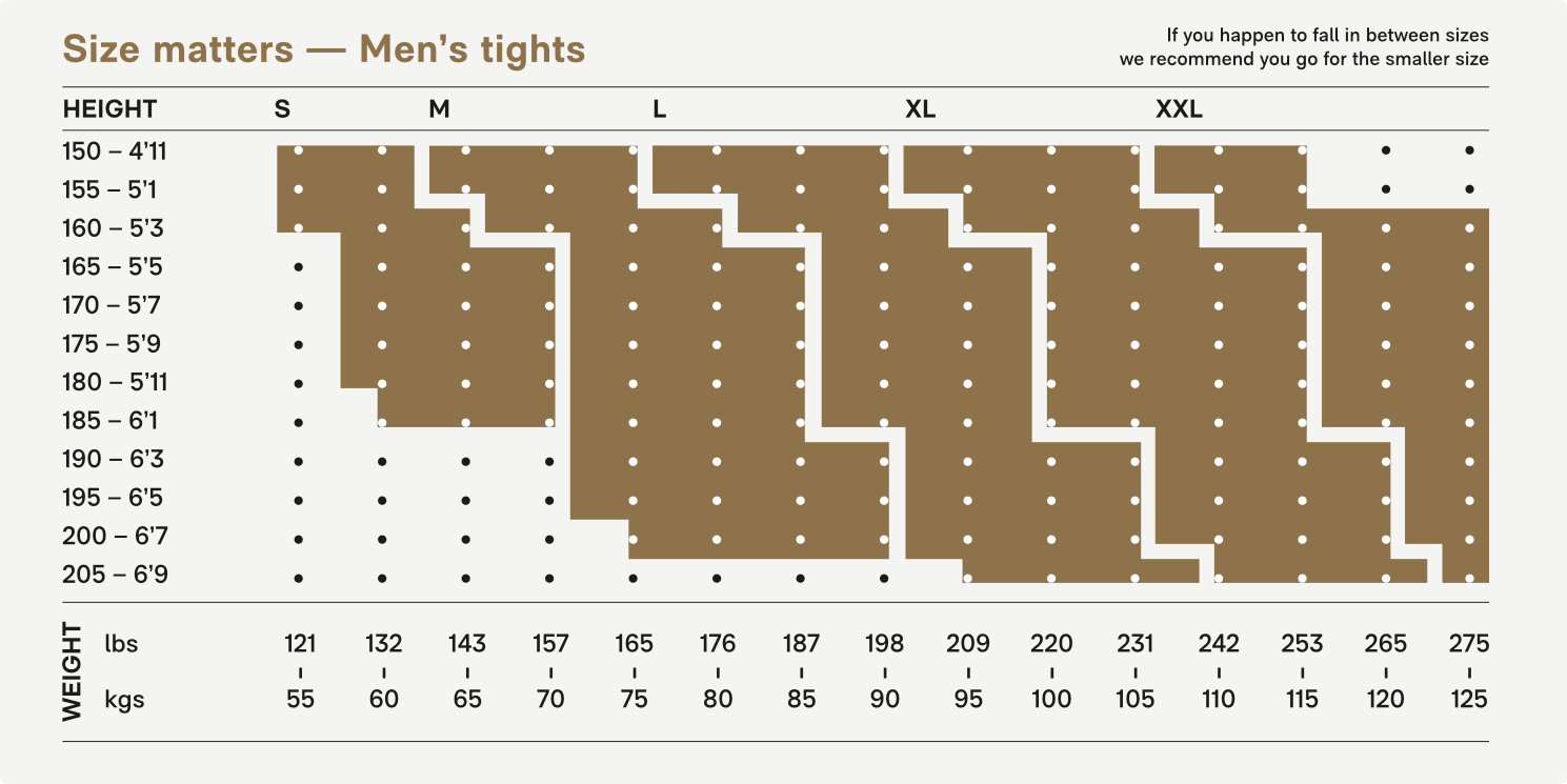 If you end up falling on the borderline between two sizes we recommend choosing the smaller size for tights but the larger size for tops.